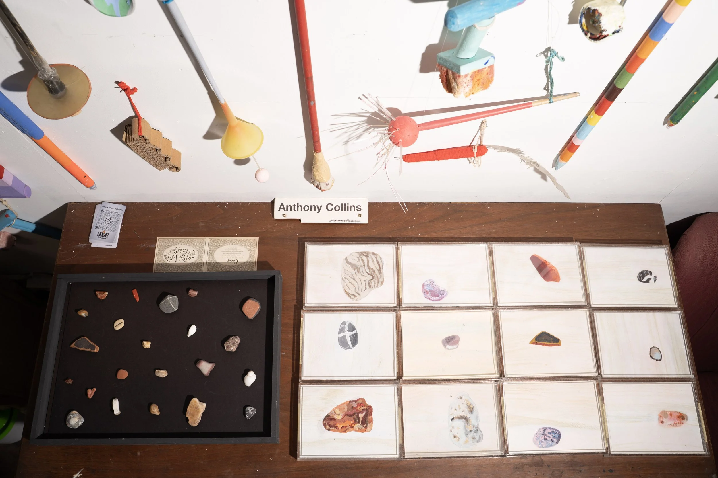 Collins’ painting style is experimental, often blending watercolour, acrylic, and unconventional supports. His practice emphasizes colour, mark-making, and playful unpredictability, inviting participants and viewers alike to engage with art in ways that encourage both reflection and joy. Over the years, he has created hundreds of handmade tools used in his participatory projects, producing thousands of images that document encounters with people, places, and moments in time.