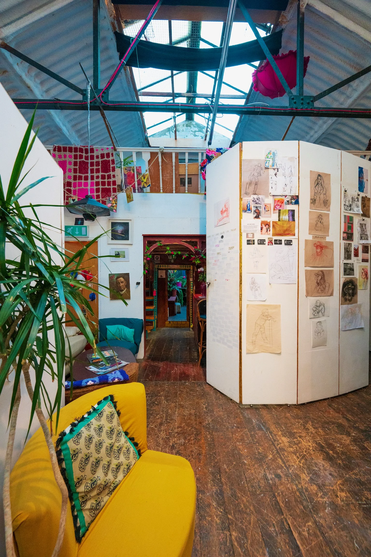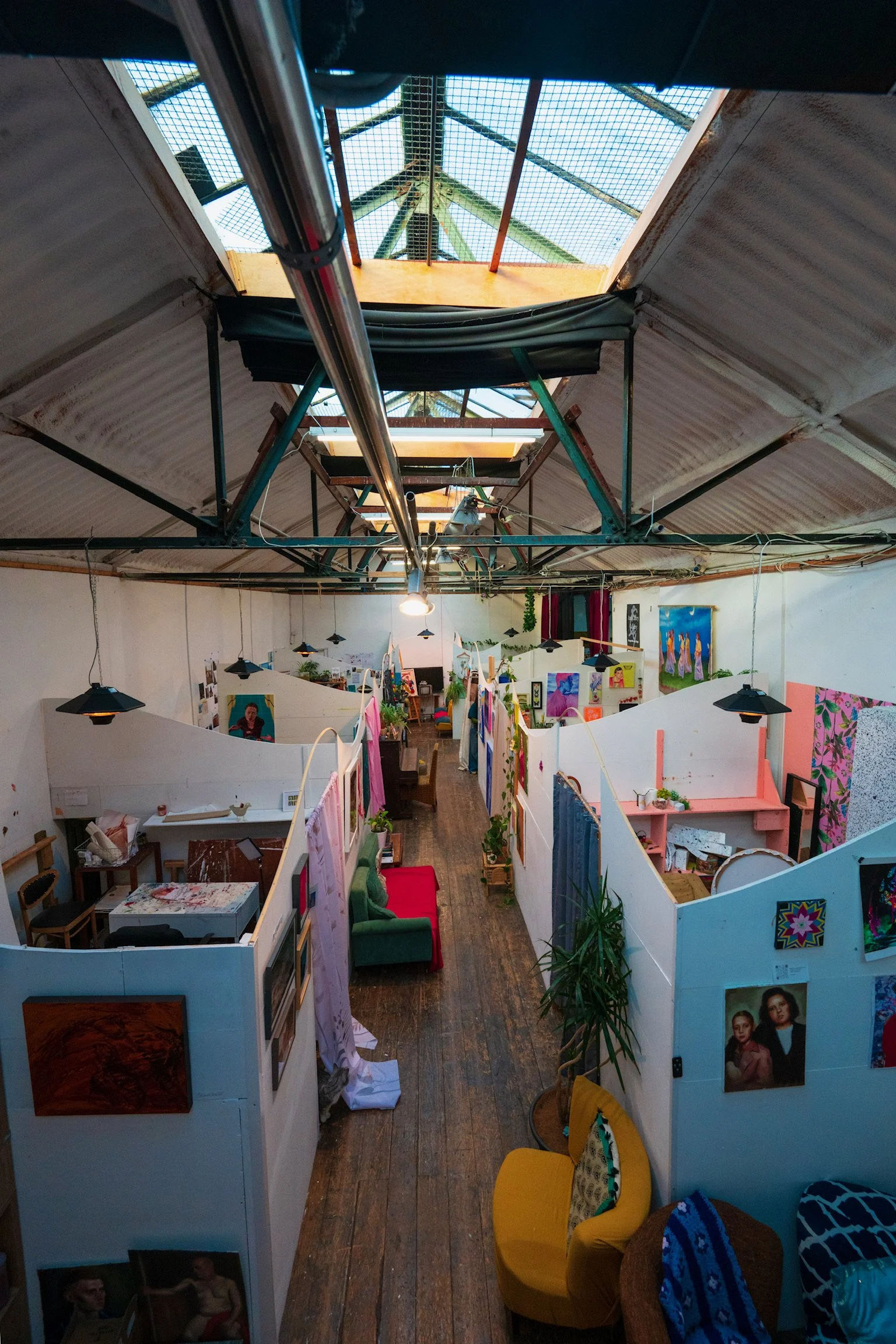 In addition to the 24 private studio units in the main Front Loft, La Catedral Studios also accomodate the Back Loft Creative Hub, a complementary bright inspiring self contained space, featuring eight partitioned studios with privacy curtains, 5 mini pods mainly dedicated to desk work and a dedicated loft-style office space. The Hub comes with wi-fi, heating, a fully fitted bohemian kitchen and features also an artful, leafy outdoor patio, a Project Space supporting larger-scale and process-based work and a comfortable sitting area for conversation and cross-dialogue.