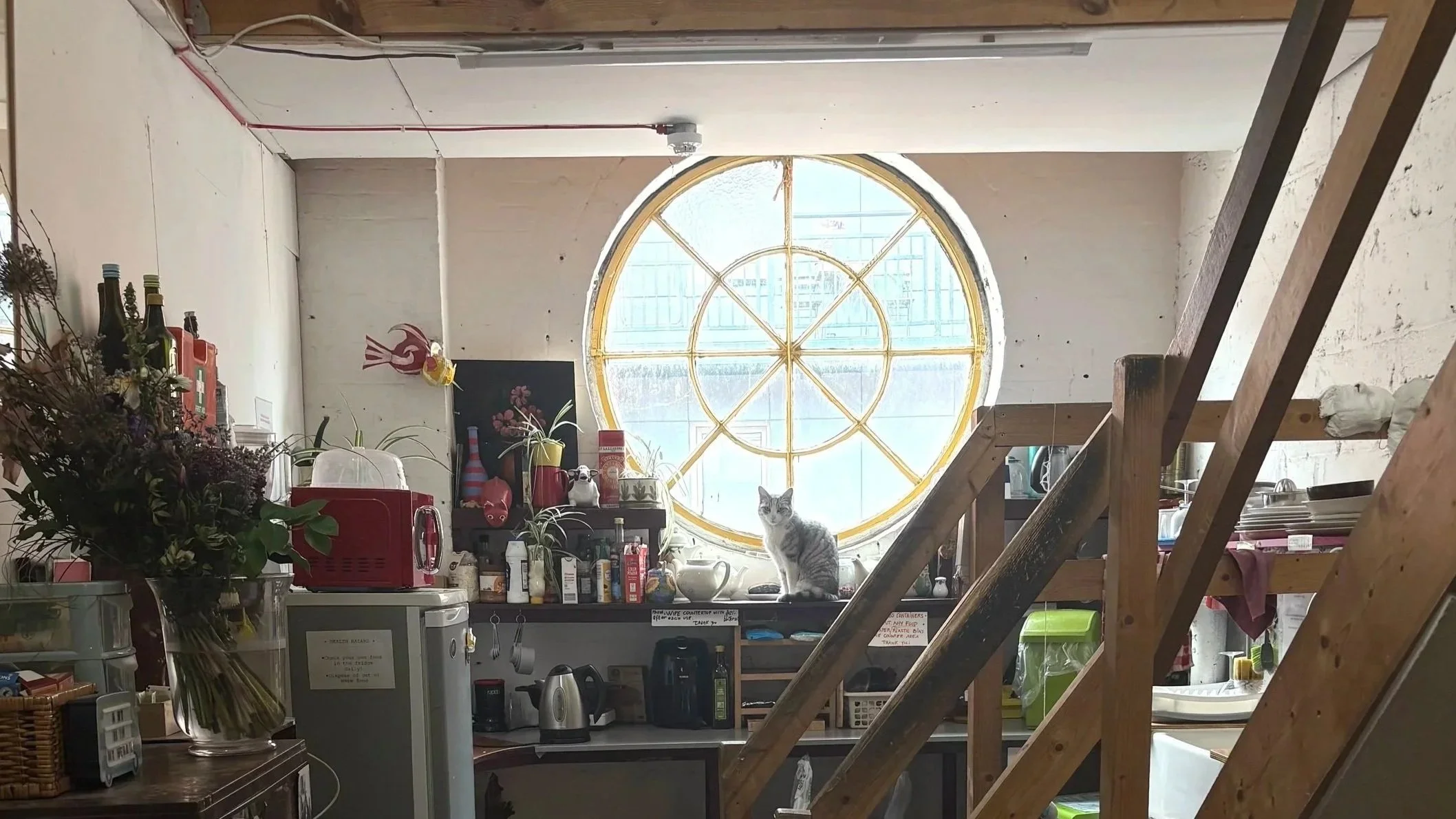 The Front Loft retains the architectural identity of the building while supporting a focused and sustained studio practice. The space also includes a workshop, along with a shared sitting area and kitchen, ornamented by a distinctive round heritage window, that contribute to the everyday rhythm of the studio.